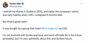 - Late 2021/Early 2022, Tucker Max and Zach Obront step back, and sell their shares in Scribe to pursue very different paths. (Tucker is raising sheep and Zach is working in Crypto.)